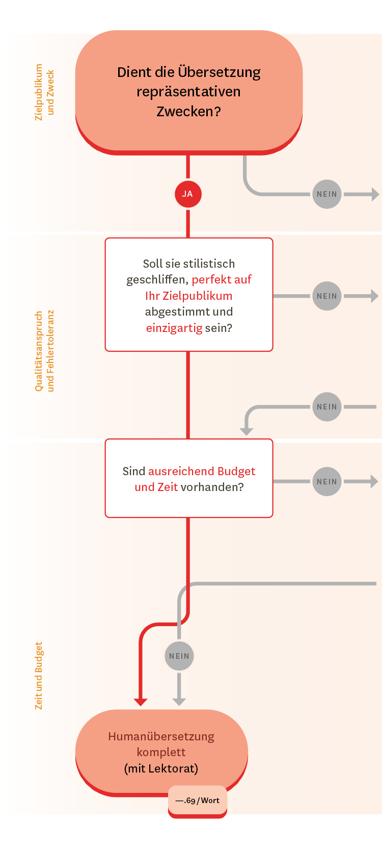 - Wird die Übersetzung zu repräsentativen Zwecken publiziert (z. B. auf Ihrer Website, in Ihrem Geschäftsbericht oder Kundenmagazin, in Schulungsunterlagen oder Medienmitteilungen) und möchten Sie damit Kunden, Behörden oder andere externe Ansprechpartner erreichen und Ihre Botschaft möglichst wirkungsvoll übermitteln? In diesem Fall empfehlen wir eine Humanübersetzung. → Weiter zur Ebene «Qualitätsanspruch und Fehlertoleranz».