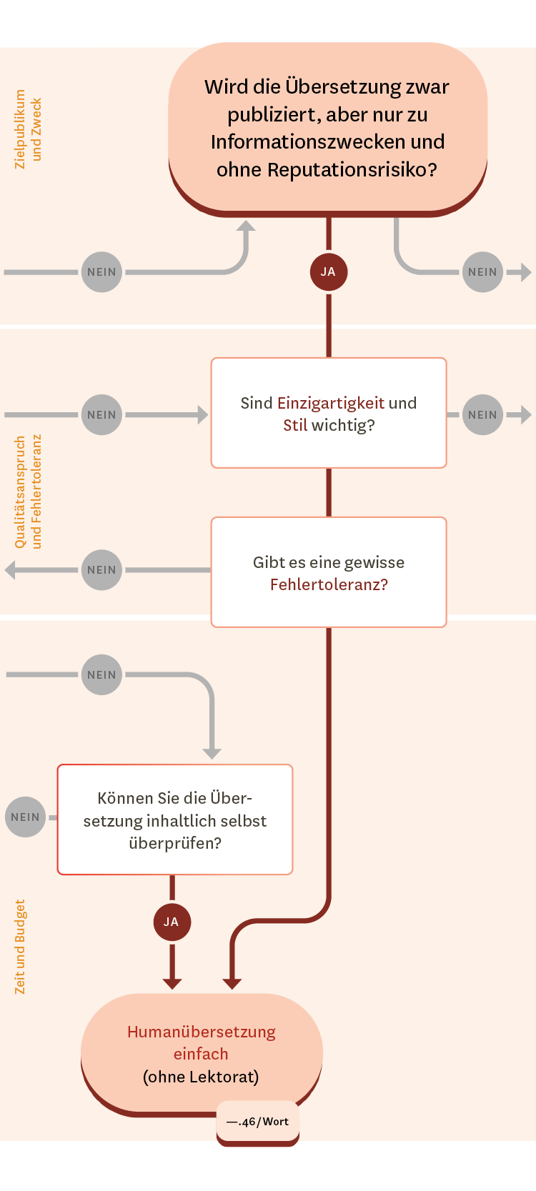 - Wird die Übersetzung zwar für ein grösseres Zielpublikum publiziert, dient aber lediglich zu Informationszwecken ohne Reputationsrisiko (z. B. in Bedienungsanleitungen oder Qualitätsrichtlinien), kommen sowohl eine Humanübersetzung als auch eine maschinelle Übersetzung mit Post-Editing in Frage. → Weiter zur Ebene «Qualitätsanspruch und Fehlertoleranz».