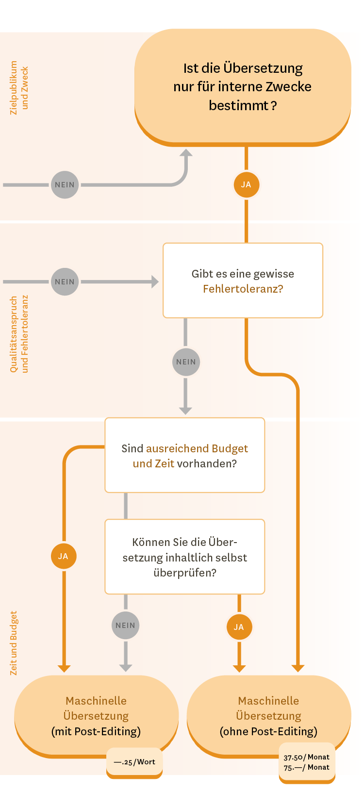 - Richtet sich die Übersetzung an eine kleinere interne Zielgruppe (z. B. in Protokollen oder im Intranet) oder dient sie lediglich zum Verständnis, kommt eine maschinelle Übersetzung mit oder ohne Post-Editing in Frage. → Weiter zur Ebene «Qualitätsanspruch und Fehlertoleranz».